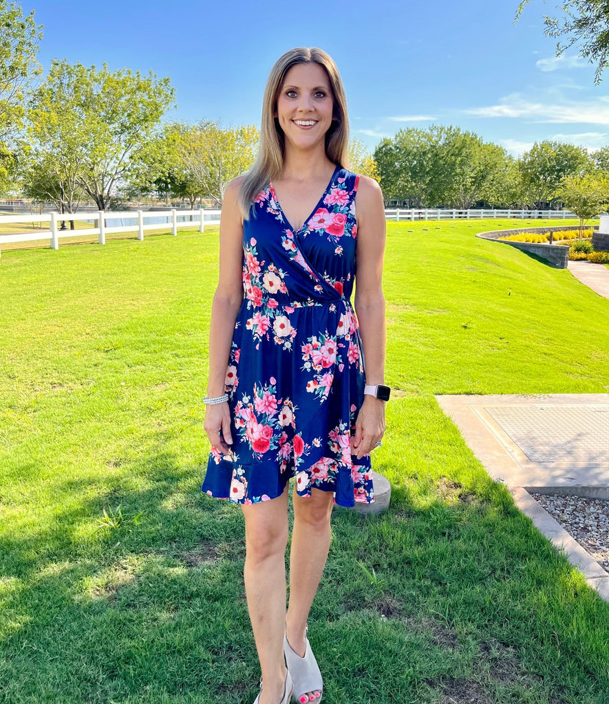 You will fall in love with this beautiful navy blue floral dress. With features like the vibrant floral detail, elastic waist, ruffled hemline that scoops down longer in the back, it's everything you want and need in a summer sundress. The cross-over front has a small snap on the inside. Pair it with sandals, a white bag and a hat for a perfect sunny afternoon.